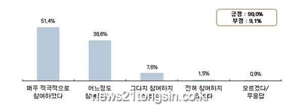 또한 대구시민 스스로 3.28 대구운동에 얼마나 적극적으로 참여하였는지에 대한 질문에서도 대부분(90%)의 응답자가 시민이 적극적으로 참여한 것으로 평가했다.