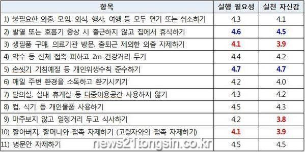방역 수칙별 실행 필요성과 시민들의 실천 자신감을 알아본 결과, 11개 수칙 대부분 실행 필요성과 실천 자신감이 높았으며, 특히 ‘손씻기 등 개인위생 수칙 준수하기’가 실행 필요성과 자신감 모두 가장 높게 나타났으며, ‘마주보지 않고 일정거리 두고 식사하기’는 실행 필요성은 높은 반면, 실천 자신감은 상대적으로 낮은 것으로 조사됐다.