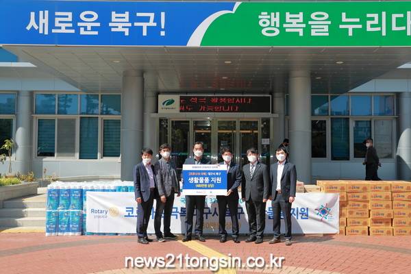 (대구=뉴스21통신) 유재원기자 = 국제 로타리 3700지구는 5월 7일(목) 오후 2시 30분, 북구청을 방문하여 코로나19 극복을 위해 라면 48박스, 휴지 66묶음, 햇반 68박스, 세제 68개 등 480만원 가량의 후원물품을 기탁했다.