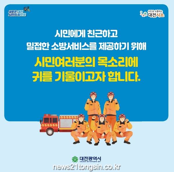 대전시 소방본부는 온라인 정책플랫폼 ‘대전시소’를 통해 수렴한 소방과 관련된 시민들의 다양한 의견을 대전시 소방정책에 적극 반영한다고 13일 밝혔다.