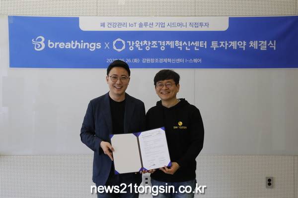 강원창조경제혁신센터(센터장 한종호, 이하 ‘강원혁신센터’)가 26일 브레싱스(주)(대표 이인표)와 3천만 원의 시드투자 계약을 체결했다고 밝혔다.