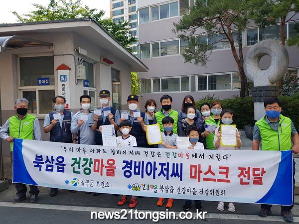 (경북=뉴스21통신) 유재원기자 = 북삼읍 건강마을은 지난 29일 건강마을참여 5개 아파트마을 경비원에게 손 편지와 함께 면 마스크 100여 장을 전달했다.