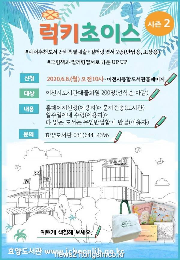 이천시(시장 엄태준) 효양도서관은 8일부터 코로나19 장기화로 지친 시민들의 피로감을 해소하고 소소한 행복을 전달할 “럭키초이스 시즌2”를 운영한다.