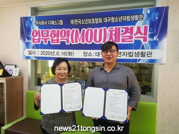 (대구=뉴스21통신) 박창남 기자 = 대구 달서구는 지난 6월 16일 ㈜디에스그룹(대표 정희준)은 대구청소년자립생활관과 업무협약체결했다고 밝혔다.