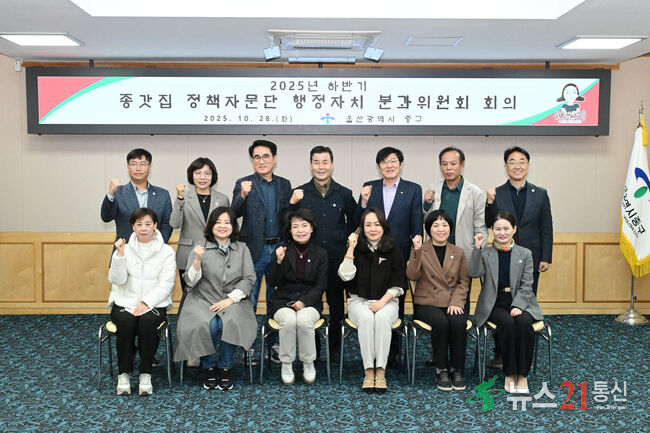 사진=중구청제공[뉴스21 통신=김보미 ]울산 중구(구청장 김영길)가 28일 중구청 중회의실에서 2025년 하반기 종갓집 정책자문단 행정자치 분과위원회 회의를 개최했다. 이번 회의에는 행정자치 분과위원회 위원 및 관계 공무원 등 11명이 참석해 행정지원국의 주요 시책을 살펴보고 구정 발전 방안을 논의했다.