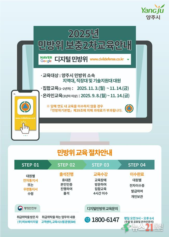 양주시가 오는 11월 3일부터 민방위 교육 미이수 대원을 대상으로 민방위 보충 2차 교육을 실시한다. 이번 교육은 ▲민방위 제도 ▲심폐소생술 등 응급처치 ▲화재 초기진화 및 대피요령 ▲화생방 방호요령 및 방독면 착용법 등 유사시 실전 역량 강화를 위한 내용으로 구성된다. 1~2년차 민방위 대원은 오는 11월 3일부터 14일까지 실...