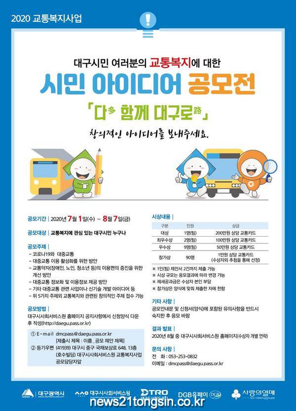 (대구=뉴스21통신) 유재원기자 = 대구광역시사회서비스원은 시민들의 교통복지에 대한 관심을 높이고, 지역 특성에 맞는 혁신적인 교통복지 사업을 발굴해 추진하고자 ‘2020년 「다 함께 대구로」시민 아이디어 공모전’을 개최한다.