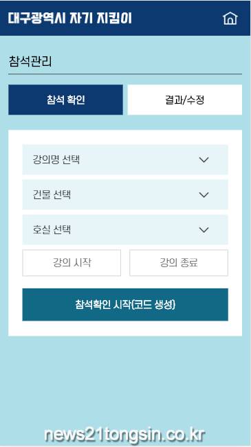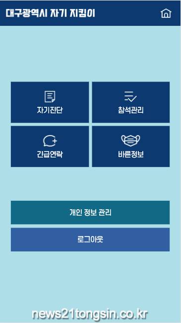 (대구=뉴스21통신) 유재원기자 = 대구시는 지역대학의 대면수업 및 기말시험 시행에 따른 코로나19 방역활동을 지원하기 위해 자기진단과 출석 연동 기능을 탑재한 대학교용 ‘자기진단 앱’을 전국 최초로 개발해 무상으로 보급했다.