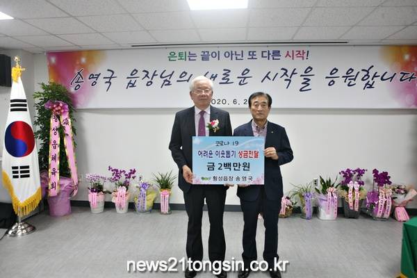 40년간 공직생활을 뒤로하고 6월 30일자로 퇴임한 송영국 횡성읍장이 코로나19로 힘든 시기를 보내고 있는 군민들과 어려운 이웃에 써 달라며 강원도사회복지공동모금회에 성금 2백만원을 기탁했다.