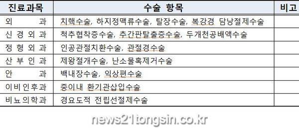 수술 지원 진료과목은 외과, 신경외과, 정형외과, 산부인과, 안과, 이비인후과, 비뇨의학과 7개 진료과로 지역 의료이용 현황과 연령별 수술 현황을 참고하여 수술 빈도가 높은 항목을 선정했다.