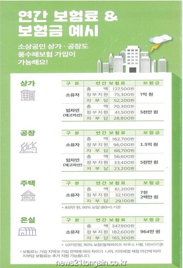 ▲ 연간 보험료 및 보험금 예시풍수해보험은 행정안전부가 관장하고 5대 민영보험사가 운영하는 정책보험으로, 국가와 지자체에서 가입대상에 따라 보험료의 일부를 지원해 시민들이 저렴한 보험료로 풍수해 피해를 보상받도록 하는 선진국형 재난관리제도이다.