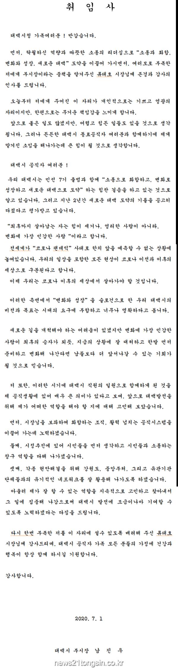 태백시가 코로나19 확산 예방을 위해 제24대 부시장의 취임식을 개최하지 않은 가운데, 신임 남진우 부시장이 내부 행정망을 통해 취임사를 전했다.