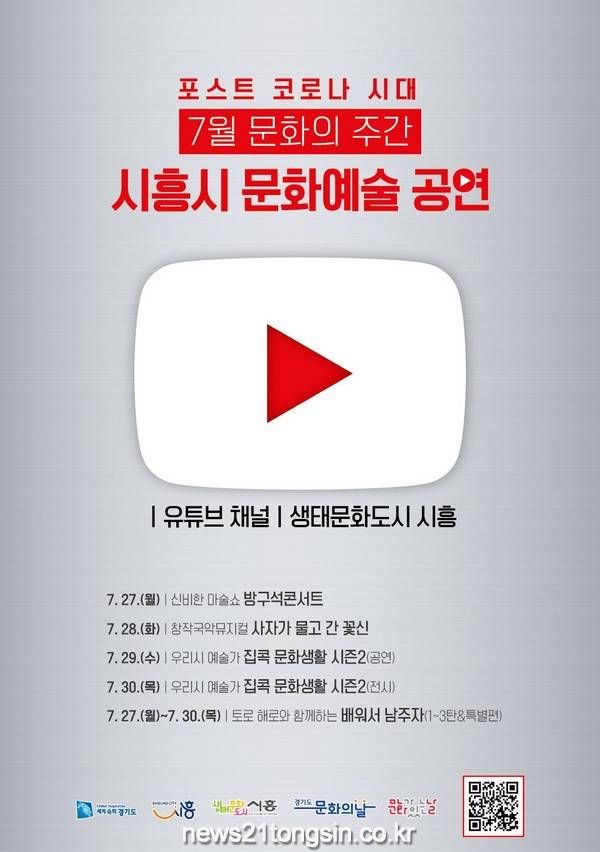 시흥시(시장 임병택)가 7월 문화의 주간을 맞아 시민들과 예술인을 응원하고자 흥미로운 문화 공연과 전시를 ‘생태문화도시 시흥’ 유튜브를 통해 송출한다.