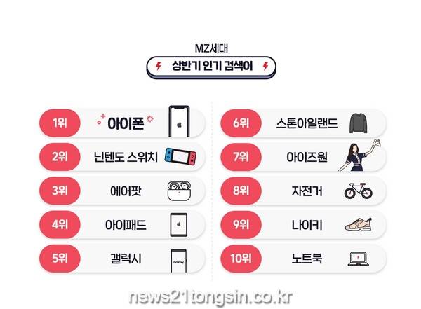 검색어 Top 10중 1위, 3위, 4위는 모두 아이폰·에어팟·아이패드 등 애플 제품으로 MZ세대의 애플 제품 사랑을 여실히 보여줬다. 2위는 상반기 열풍으로 품귀현상을 빚은 닌텐도 스위치가 차지했는데 닌텐도 스위치는 전년도 대비 검색 수가 4배 이상 폭발적으로 증가했으며 거래도 활발하게 이뤄져 거래액은 11배 증가했다.