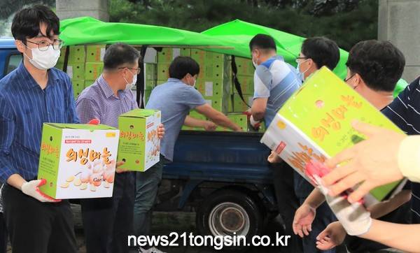 이번 행사는 코로나19 여파로 농산물 판매에 어려움을 겪는 의성군 농민들을 돕고 면역력에 좋은 햇마늘을 먹고 코로나19를 이겨내자는 뜻으로 달서구청 직원들이 발벗고 나섰다.