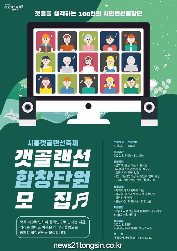 시흥시(시장 임병택)는 오는 9월 16일부터 10월 30일까지, 45일간 온라인으로 열리는 시흥갯골랜선축제에서 진행될 ‘시흥갯골랜선합창단’ 단원을 모집한다.