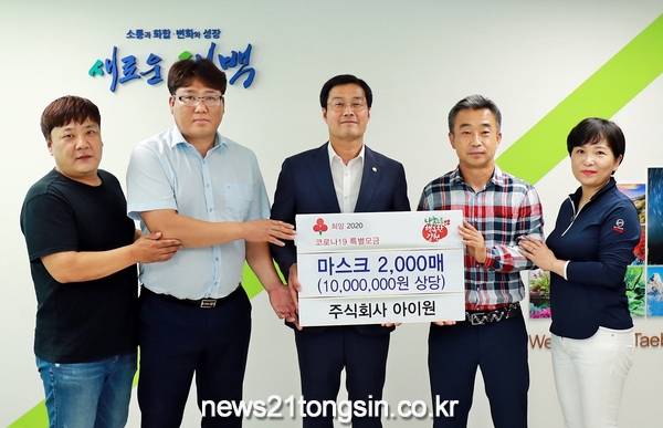 ㈜아이원(대표 이어진) 강원총판사업부 직원들이 4일(화) 태백시에 코로나19 극복을 위한 나눔 프로젝트로 저소득층 아동 및 청소년을 위한 마스크 2,000매(1,000만 원 상당)를 기탁했다.