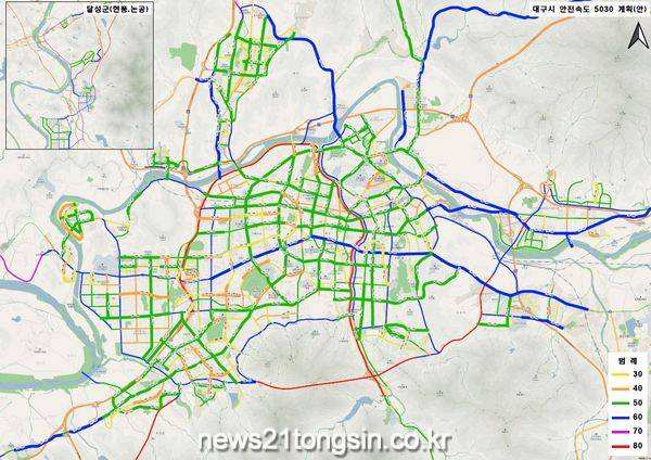 (대구=뉴스21통신) 유재원기자 = 대구시와 대구지방경찰청은 2021년 4월 도시부 제한속도를 하향하는「안전속도 5030」정책의 전면시행에 맞춰 속도관리 대상 266개 도로에 대해 제한속도 계획(안)을 마련하고 이달부터 대구시 홈페이지에서 시민 의견을 듣는 등 본격 추진에 나선다.