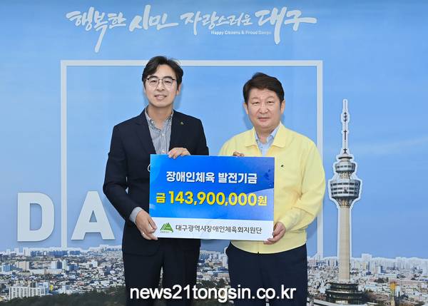 (대구=뉴스21통신) 유재원기자 = 대구광역시장애인체육회(회장 권영진)는 市장애인체육회지원단(단장 박학수)에서 지역 장애인체육 발전을 위한 후원금 143,900,000원을 기부했다고 4일 밝혔다.