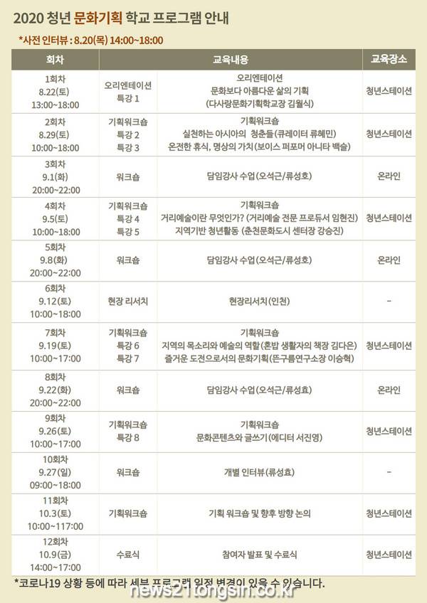 교육은 8월 22일부터 10월 9일까지 정왕동 청년스테이션에서 진행하며, 코로나19상황에 맞춰 온라인 교육도 병행한다.