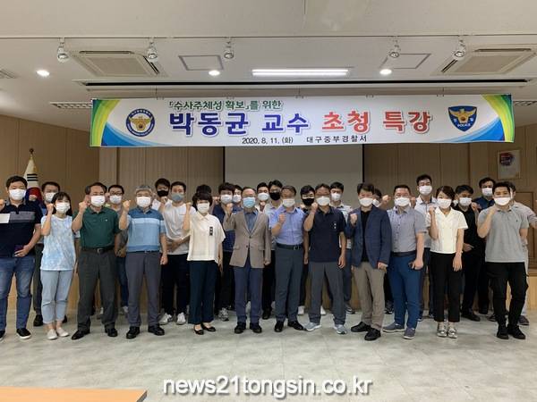 (대구=뉴스21통신) 유재원기자 = 대구중부경찰서(서장 양원근)에서는 대구한의대학교 경찰행정학과 박동균 교수를 2020.8.11.(화) 초청하여 경찰서 강당에서 ‘인권존중을 바탕으로 하는 경찰수사’라는 주제로 특강을 실시하였다.