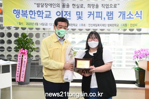 윤화섭 안산시장은 장애인 지원을 위해 14일 시민시장에 개소한 ‘커피, 랩’ 카페를 방문해 앞으로의 번창을 기원했다.