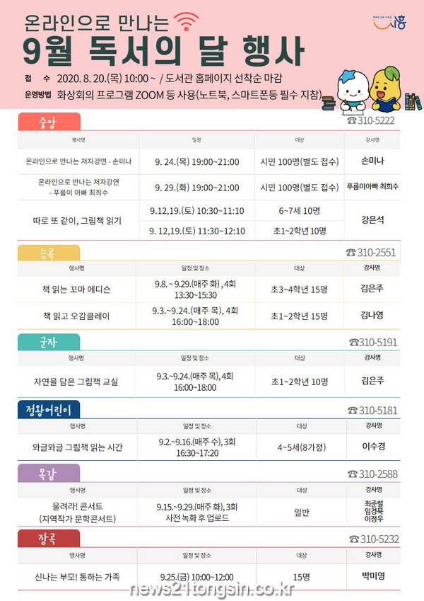 참여를 원하는 시민은 8월 20일부터 시흥시 중앙도서관 홈페이지를 통해 신청할 수 있으며, 자세한 내용은 시흥시중앙도서관(031-310-5222)으로 문의하면 된다.