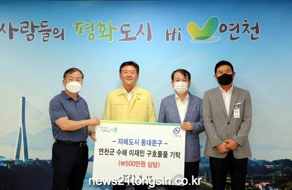 연천군과 동대문구는 2014년 동대문구 신설동에 연천장학관 개관을 인연으로 2016년 동대문구와 자매결연을 맺어 다방면에서 교류를 이어왔으며, 연천군에 폭우가 시작됐을 때부터 지속적으로 연천군 피해상황을 모니터링 하고 자매도시인 연천군에 여러방면으로 도움을 주고자 모색하다가 지난 19일(수)에 이재민들이 실질적으로 사용할 수 있는 생활용품 등 500만원 상당의 구호물품을 기탁하였다.