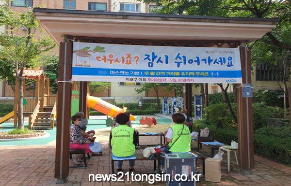 야외 무더위쉼터 16개소는 마포구 자원봉사센터의 봉사자들이 관리를 맡아 방문자 마스크 착용 및 발열 체크, 이용자 간 거리두기 안내, 쉼터 내 소독 등 코로나19 감염 예방을 위한 방역 수칙을 철저히 이행하고 있다.