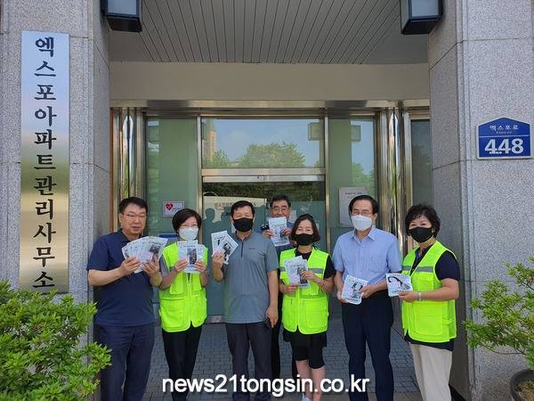 ▲ 20일 김선희 전민동장과 전민동 지역사회보장협의체 위원들이 아파트 경비원들에게 홍보 리플릿과 물품을 전달하고 기념촬영을 하고 있다.