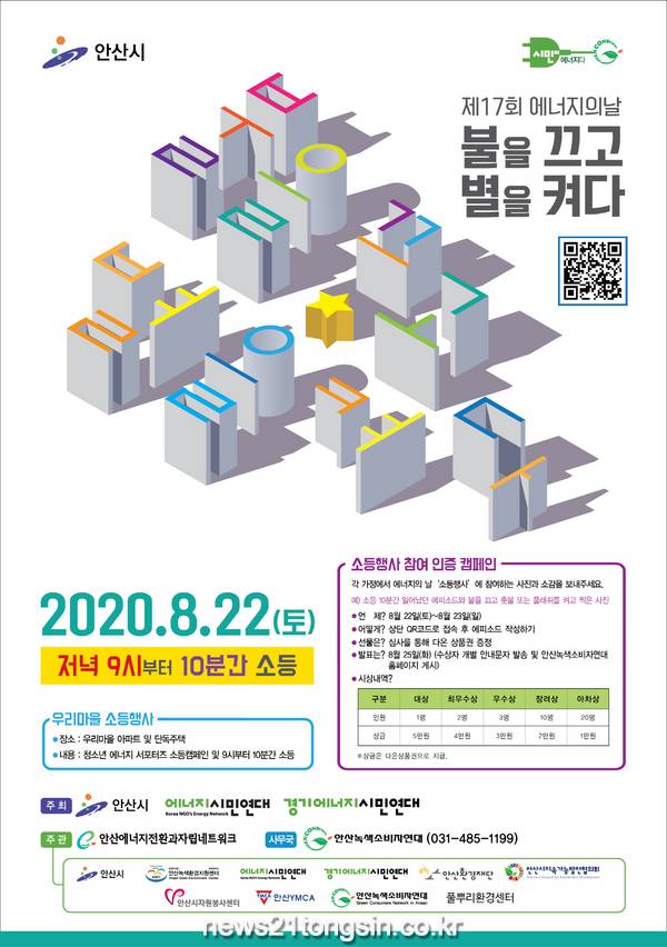 시는 오는 23일까지 소등행사에 참여한 사진, 에피소드 등을 에너지의 날 QR코드에 접속해 작성한 시민에 대해 심사를 통해 36명을 선정해 안산화폐 다온을 증정할 예정이다.