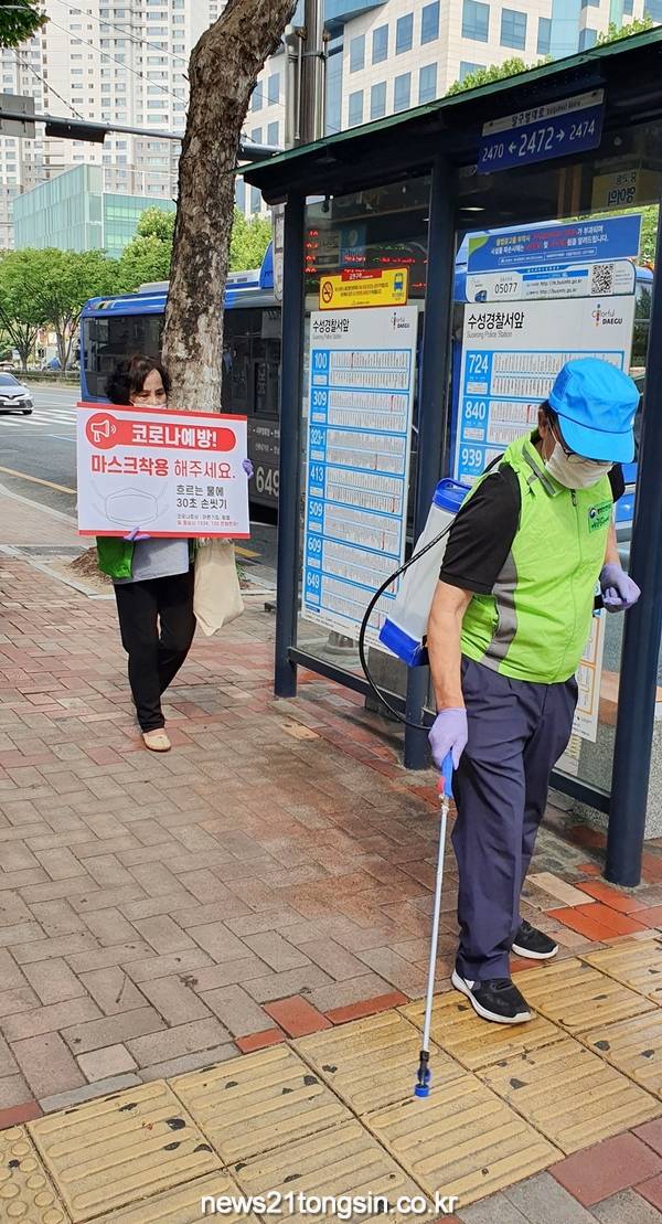 (대구=뉴스21통신) 유재원기자 = 대구 수성구는 지난 24일 제7기 수성구 생활공감정책참여단이 코로나19 감염 예방을 위해 버스정류장 방역과 캠페인을 실시했다고 밝혔다.