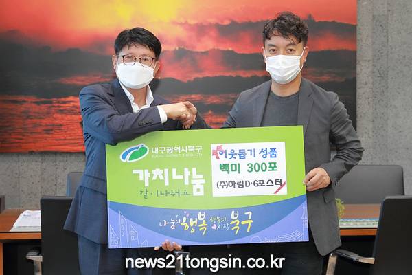 (대구=뉴스21통신) 유재원기자 = ㈜하림DᐧG포스터(대표 김현수)는 8월 25일(화) 북구 관내 저소득층에 전달해 달라며 백미(4kg) 300포를 북구청에 기탁했다.