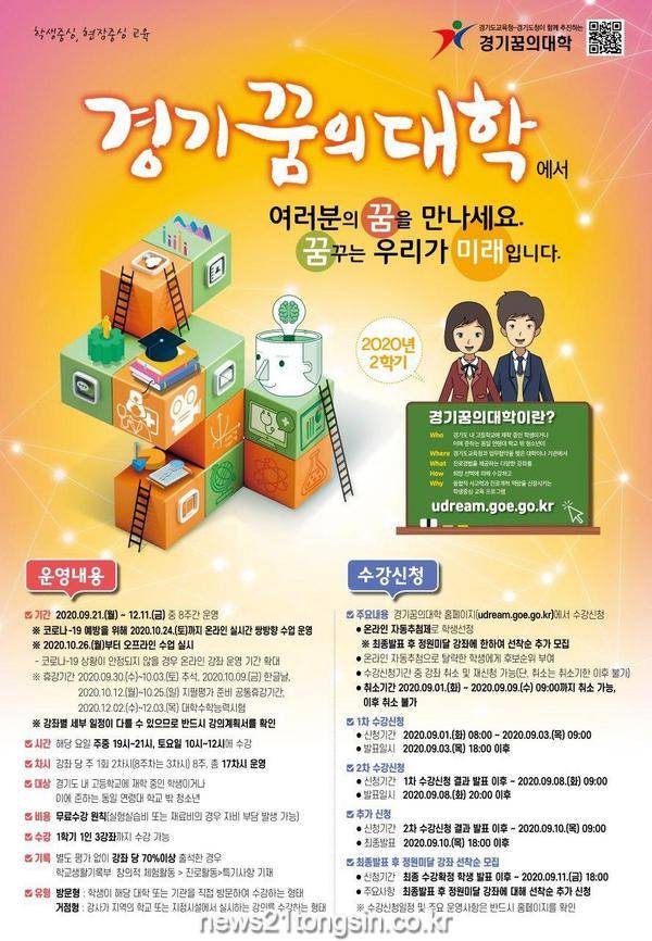 경기도교육청(교육감 이재정)이 9월 1일부터 10일까지 도내 고등학생과 학교 밖 청소년을 대상으로 ‘2020 경기꿈의대학 2학기 수강 신청’을 받는다.