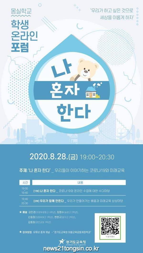 경기도교육청(교육감 이재정)이 28일 오후 7시부터 경기도교육청마을교육공동체정책과유튜브채널에서 코로나19로 인한 삶과 교육의 변화를 주제로 몽실학교 학생 온라인 포럼 ‘나 혼자 한다’를 진행한다.