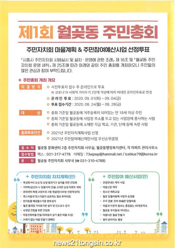 이에 따라 이번 주민총회는 사전투표인단이 ‘2021년 주민자치계획사업 선정’, ‘2021년 주민참여예산 제안사업 우선순위결정’의 안건에 대해 온라인 투표하는 방식으로 진행된다. 온라인 투표 기간은 9월 1일부터 4일까지이다.