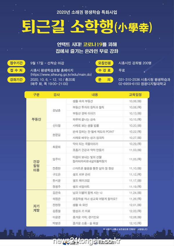 오는 10월 6일에 개강해 12월 10일까지, 총 20회로 구성된다. 시흥시 직장인이라면 누구나 신청가능하며, 수강료는 무료이다.