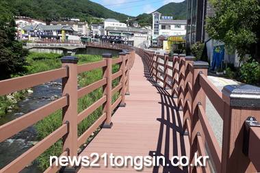 ▲ 설천면 산책로무주군이 관광객이 왕래하는 설천면 마을에 산책로를 조성했다고 8일 밝혔다. 무주군에 따르면 설천면 심곡리 등방천 일원에 보행로 기능을 겸한 산책로 조성으로 관광객과 보행자의 안전을 확보했다. 군은 사업비 5억원(도비 1억 5,000만원 포함)을 들여 설천면 심곡리 680-10번지 일원에 산책로 조성사업을 마무리했다고 밝혔다. 군은 이 구간에 대해 폭 1.5m에 총길이 324m 이르는 데크 로드를 조성해 휴식공간과 즐길 거리를 제공했다.