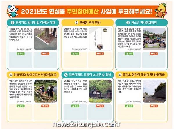 연성동 주민참여예산 지역회의(위원장 최병득)에서는 「2021년 연성동 주민참여예산사업 주민투표」를 연성동 행정복지센터에서 8월 31일부터 9월 11일까지 진행한다.