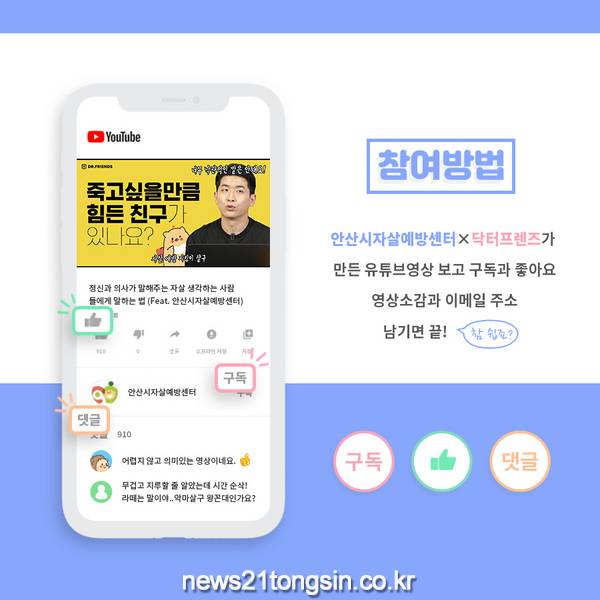 유튜브 영상은 10일부터 닥터프렌즈와 안산시자살예방센터 유튜브 채널을 통해 시청할 수 있으며, 시청 후 안산시자살예방센터 유튜브 채널에 댓글로 소감을 남기면 선물을 증정하는 이벤트에 참여할 수 있다.