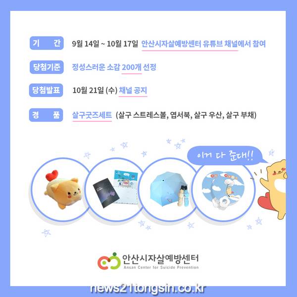안산시(시장 윤화섭) 자살예방센터는 9월 10일 세계 자살예방의 날을 맞이해 ‘정신과 의사가 말해주는 자살을 생각하는 사람들에게 말하는 법’을 주제로 한 유튜브 방송과 함께 댓글 참여 이벤트를 진행한다고 11일 밝혔다.