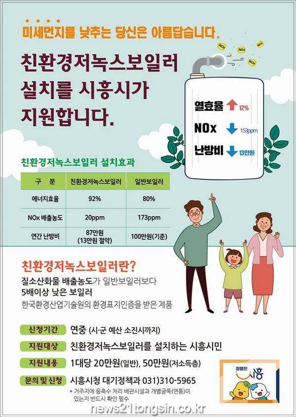지원대상은 올해 한국환경산업기술원의 환경표지 인증을 받은 가정용 저녹스 보일러를 설치 한 시흥시소재 주택소유주 또는 소유주의 위임을 받은 세입자(공공기관 및 공공시설은 제외)다.