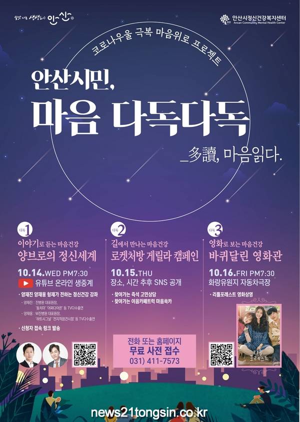 안산시정신건강복지센터는 10월 10일 ‘세계 정신건강의 날’을 맞아 코로나바이러스감염증-19 사태 이후 무기력하고 우울해진 시민들의 마음을 위로하기 위해 정신건강행사를 다채로운 비대면 방식으로 진행한다고 21일 밝혔다.