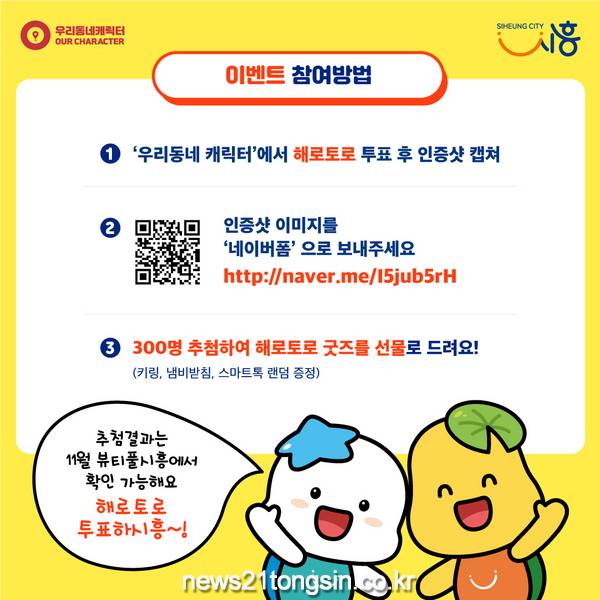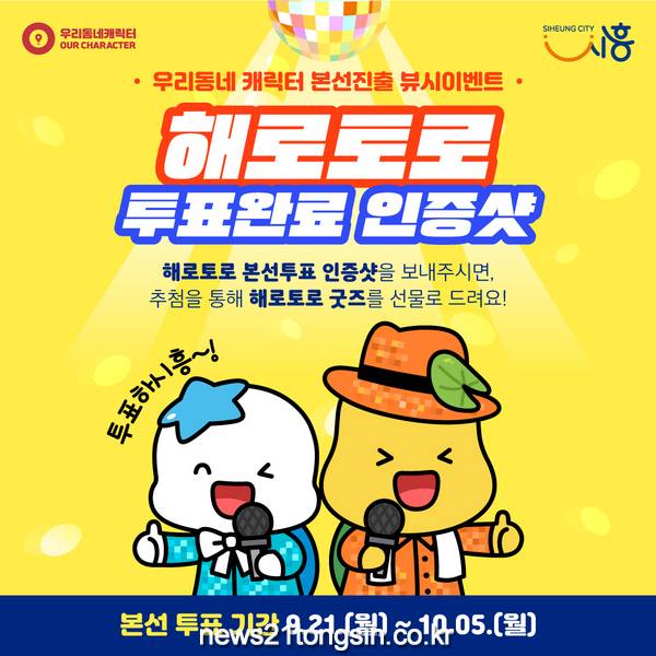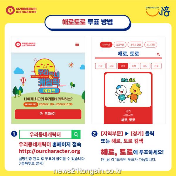 이종성 시흥시 홍보담당관은 “우리동네 캐림픽에 출전한 ‘해로와 토로’가 좋은 성적을 거둘 수 있도록 시민 여러분의 많은 참여를 바란다”며 “앞으로 캐릭터를 활용한 다양한 콘텐츠 개발로 시민들에게 더욱 가까이 다가가고, 전국에 시흥을 알리는데 노력하겠다”고 밝혔다.