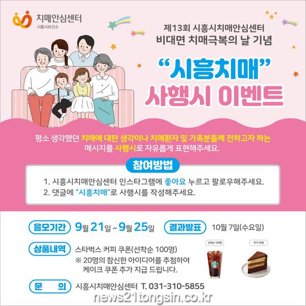 아울러, 치매극복 주간 행사로 9월 21일부터 25일까지 ‘시흥치매’ 사행시 이벤트를 진행해 시흥시치매안심센터 인스타그램에 ‘좋아요’ 누르고 팔로우한 후 댓글에 ‘시흥치매’ 로 사행시를 작성하면 선착순 100명에게 스타벅스 커피 쿠폰을 제공한다.