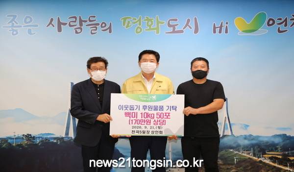 연천군 전곡5일장 상인회(회장 기호철)는 지난 21일 군수실을 방문해 관내 소외계층 등 어려운 이웃에게 전달해 달라며 백미 10kg 50포(170만원상당)를 기탁하였다.