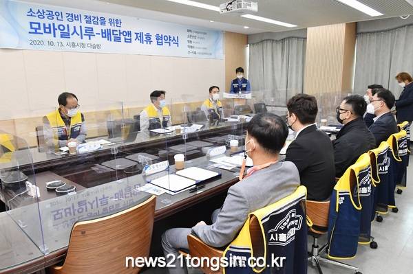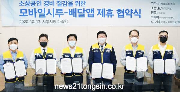시흥시는 13일 시청 다슬방에서 5개 민간 배달앱 대표들과 함께 모바일시루-배달앱 제휴 협약을 체결했다.