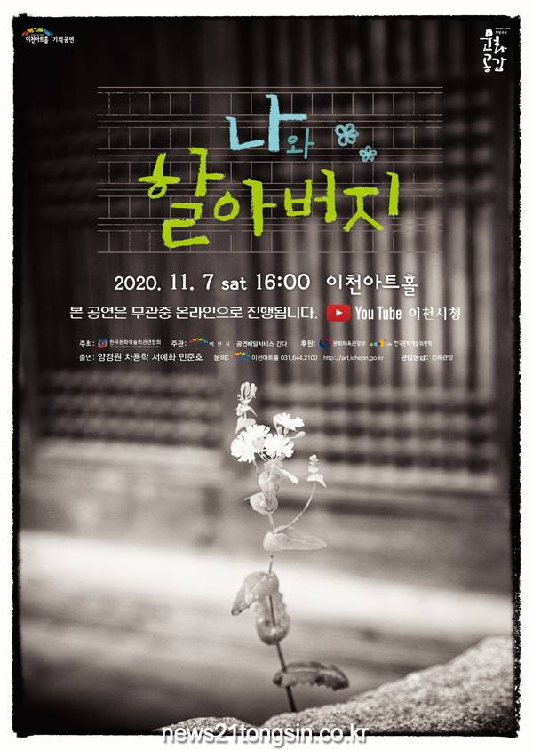 이천아트홀은 오는 11월 7일(토) 16시 ‘2020년 문예회관과 함께하는 방방곡곡 문화공감사업’의 일환으로 진행되는 극단 ‘공연배달서비스 간다’의 대표작 중 하나인 연극 ‘나와 할아버지’를 이천시청 공식 유튜브 채널(https://www.youtube.com/user/2000ishappy)을 통해 선보인다고 밝혔다.