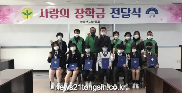 양동면새마을회(회장 박계정, 안숙자)는 지난 9일 양동면사무소에서 관내 학생들에게 장학금 240만원을 전달하기 위한 ‘사랑의 장학금 전달식’을 가졌다. 이날 장학금 전달식에는 박대식 양동면장을 비롯한 학교관계자 및 새마을회원이 참석하였으며, 봉사정신과 학업성적이 우수한 지역 학생(중학생 3명, 고등학생 5명) 총 8명에게 각각 30만원씩 전달했다.