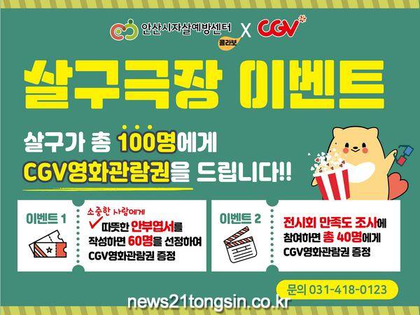 안산시자살예방센터는 올 연말까지 CGV안산점(NC백화점 6층)에서 생명을 살리고 구하는 ‘살구극장’ 캠페인을 개최한다고 11일 밝혔다.